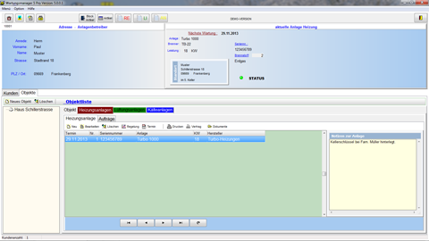 Durch die selbsterklärenden Programmfunktionen wie auch die Such- und Sortiermöglichkeiten, sind Kunden und die entsprechende Heizungsanlage schnell gefunden. Umfangreiche Listen wie Wartungstermine, Anlagenprotokolle, Wartungsnachweise und Reparaturaufträge stehen zur Verfügung. Zu den Aufträgen können auch die Abgasmesswerte hinterlegt werden. Mit einer übersichtlichen Bedienung und praxisorientierten Dokumentation von Anlagendaten wie Pumpen, Düsen, Einstellungen usw. ist der „Wartungsmanager Pro“ eine Hilfe bei der präzisen und schnellen Planung von Wartungen oder Reparaturen. Das Verwalten von Raumluft Technischen Anlagen ist in dieser Version mit enthalten.